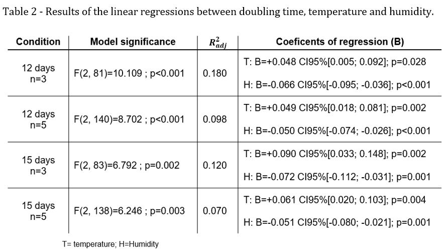 Temperature and humidity role in the doubling time of COVID-19 cases
